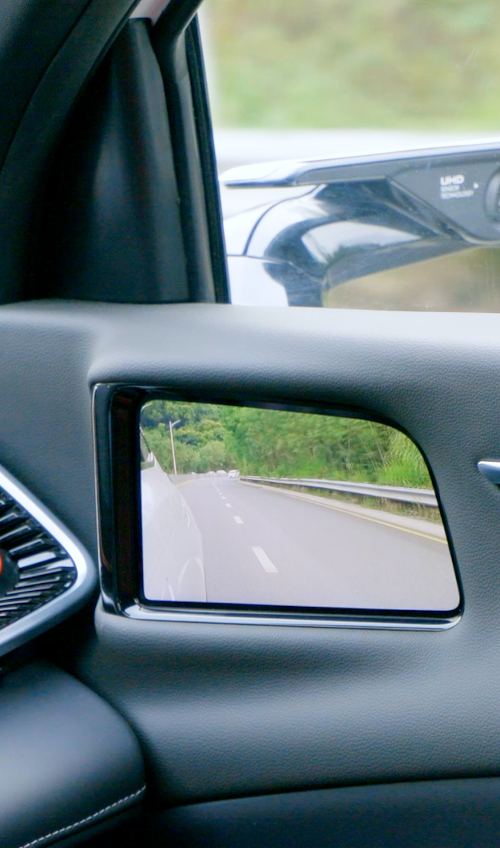 車規級OLED柔性屏貼合A柱設計,通過算法實現A柱“透明化、可視化”,不影響造型美觀與A柱強度情況下,完美解決A柱盲區問題。